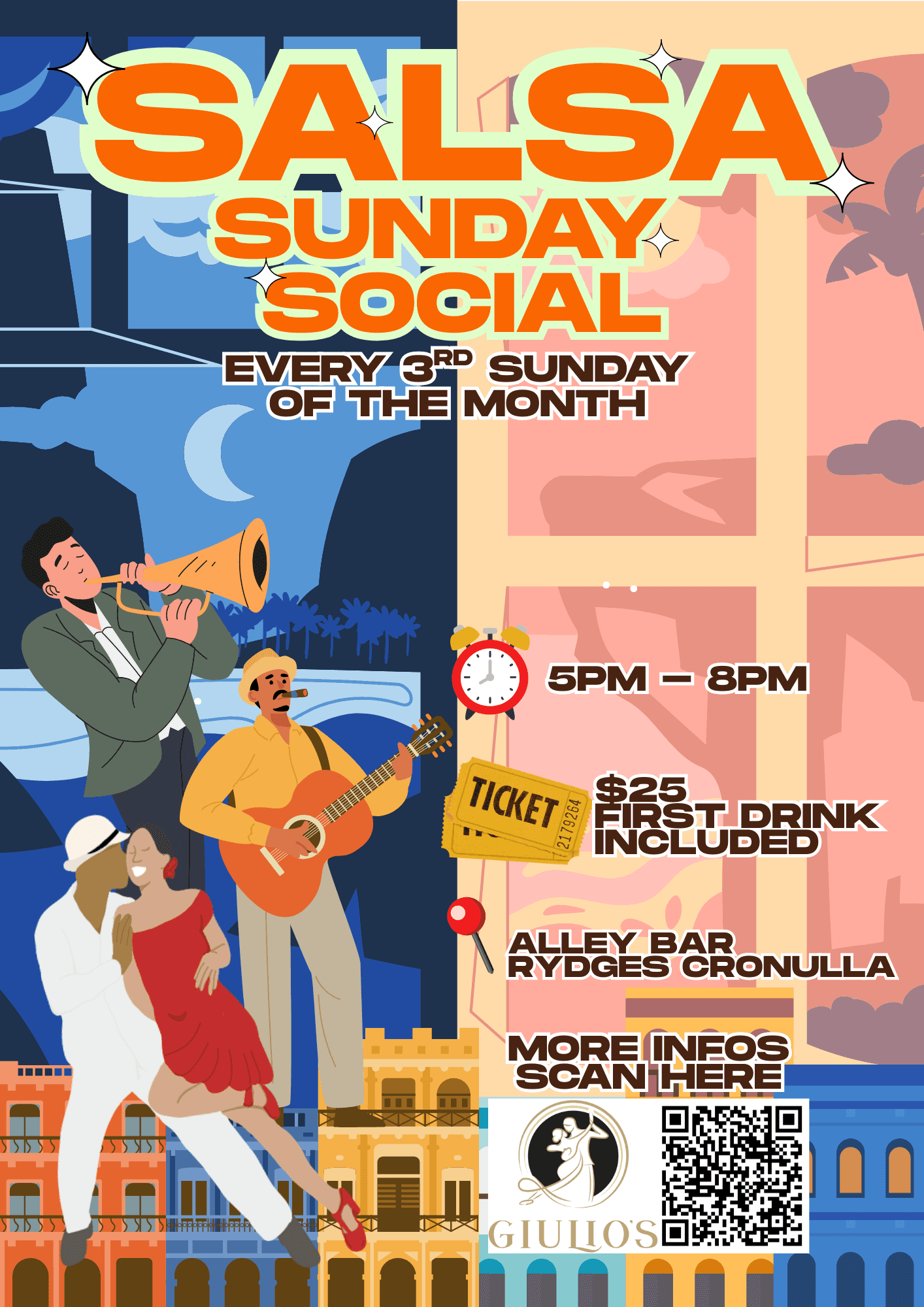 Giulio’s dance studio is the 3rd studio that I’ve taken Salsa in Sydney and by far it has been the best of all three. Guilio makes the classes fun but at the same time pays attention to everyone in the class providing people with ways to improve your dancing. I have learnt more in 2 months at Giulio’s than I had in a year at other studios. I have also met a wonderful bunch of people of all ages. I would definitely recommend!!